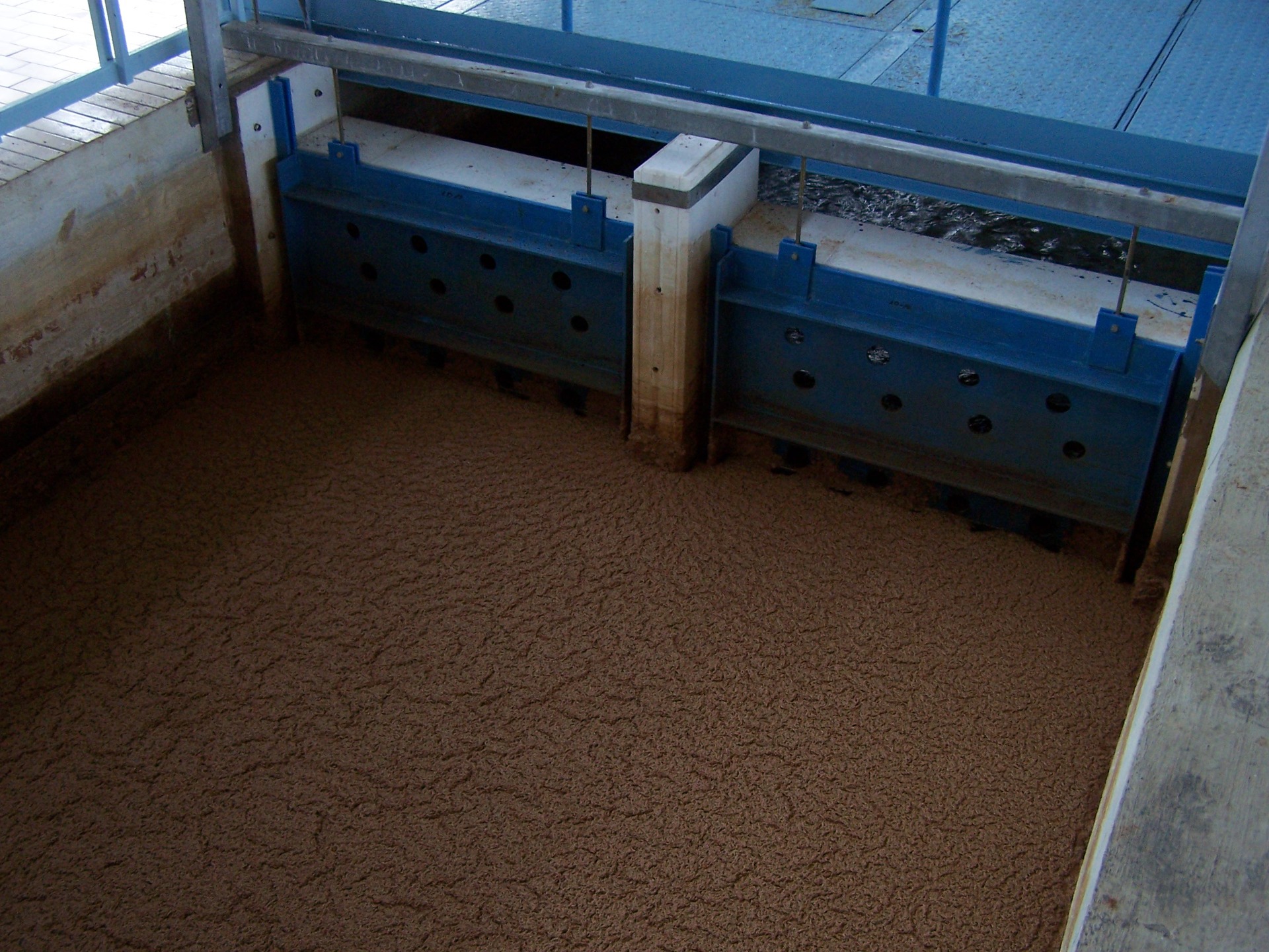 Do vody je přidán koagulátor usnadňující srážení vloček odpadu, které ještě zůstali ve vodě (prach, zbytky zeminy, rybí jikry atd...) Tyto vločky, které jsou těžší než voda, se usadí na dně dekantační nádrže a 90% látek je takto odstraněno.